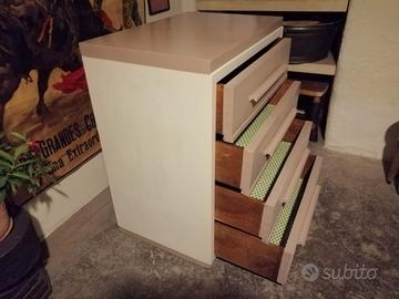 "Cassettiera in perfette condizioni, con un design moderno. - Colore principale beige/porpora con dettagli bianchi. - Realizzata in legno e perfettamente nuova restaurata - misure 75X53X92H"