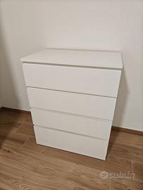 Vendo cassettiera Ikea con 4 ampi cassetti, colore bianco opaco, ideale per camera da letto, cameretta o ufficio.