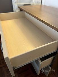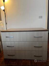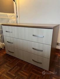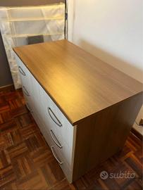 Vendo cassettiera bicolore, rovere scuro e 3 cassettoni grigio chiaro dotati di doppia maniglia.
