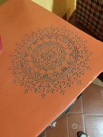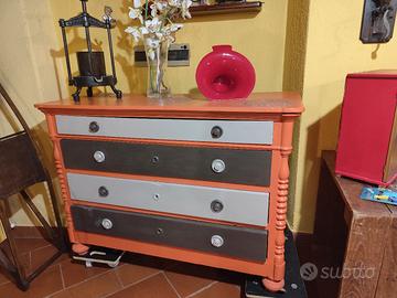 graziosa cassettiera riverniciata in colore aragosta con decori in rilievo sul piano superiore e cassetti in colore tortora e marrone misura 130x58 altezza 90 cm