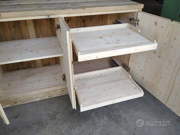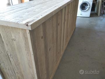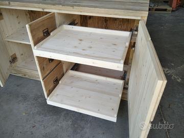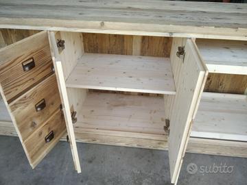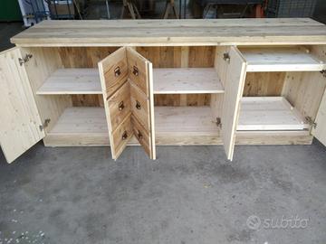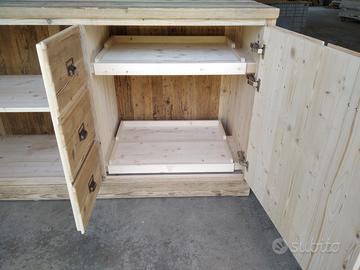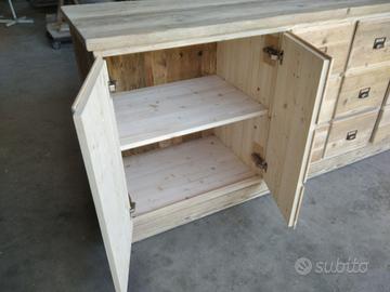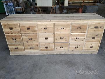 Cassettiera in legno di abete di antichi solai recuperati con misure lunghezza 250 altezza 100 profondità 65 cm con piano spessore 4 cm. con zoccolo perimetrale dritto in pattina predisposto (come richiesto dal cliente in 3 vani di cui il primo e centrale con (2+2) ante che si apriranno su cerniere da cucina regolabili ammortizzate in chiusura su pannello a 3 strati in modo che non si incurvi nel tempo con applicato frontalmente frontali in legno vecchio con maniglietta a conchiglia per apertura e internamente ripiani aggiustabili in altezza per posizionare i vari oggetti in abete da 24 mm, 3 vano con una porta unica con 6 frontali e apertura su cerniere da cucina regolabili ammortizzate in chiusura con 2 ripiani estraibili per poter inserire il pc e tastiera e riporli in caso di non uso su guide ammortizzate in chiusura con portata 40 kg. Schienale a 3 strati in legno vecchio unito con anima senza viti spessore circa 18mm. il tutto sarà smontabile sia per motivi di trasporto sia perché diventa pesante, semplice da rimontare tramite barilotti con spine di legno e perni in ferro. Il tutto finito e carteggiato e levigato in modo che sia morbido al tatto. Completo di finitura cerata neutra, in modo da non alterare il colore del legno mentre internamente sarà tintato leggermente scuro. nel prezzo è compreso di finitura franco fabbrica completo di imballo iva non comprendente. Competenza serietà ed esperienza nel settore del mobile ci contraddistinguono dal resto dei venditori. la cassettiera è stata ordinata su commissione e non è in pronta consegna ma essendo i diretti produttori possiamo costruirla SIMILE in quanto siamo i diretti PRODUTTORI FALEGNAMI. Per qualsiasi altra informazione non esitate a contattarci. ASTENERSI RIVENDITORI E COMMERCIANTI