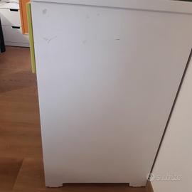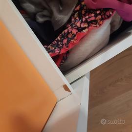 Cassettiera in legno Bopita dotata di quattro cassetti, due superiori, arancione e verde e due inferiori bianchi. Dimensioni 110 lunghezza, 55 profondità, 95 altezza. La cassettiera è in buone condizioni fatta eccezione per i difetti riportati in foto, dovuti all' usura.