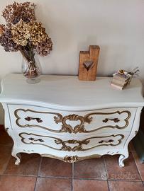 Cassettiera "Chic" bianco e oro con due ambi cassettoni. Dipinta a mano. Misure : 1,23 x 83 x 50 . Ritiro a mano.