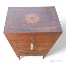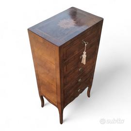 Questa piccola cassettiera in legno è un pezzo di arredamento elegante e funzionale. Realizzata in legno massiccio di alta qualità, presenta un design intarsiato che le conferisce un tocco di raffinatezza. Con i suoi cinque cassetti spaziosi , offre ampio spazio per riporre oggetti di uso quotidiano in modo ordinato. Le maniglie in metallo aggiungono un tocco di stile, mentre i piedini curvati le donano un'aria classica. Perfetta per l'ingresso o la camera da letto, questa cassettiera combina armoniosamente praticità e bellezza. Le dimensioni compatte la rendono adatta anche agli spazi più piccoli. Un mobile durevole e di qualità artigianale, ideale per aggiungere un tocco di eleganza alla vostra casa.