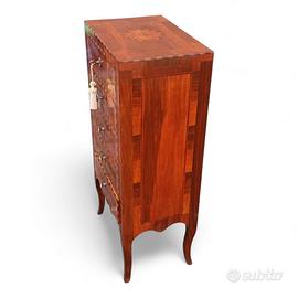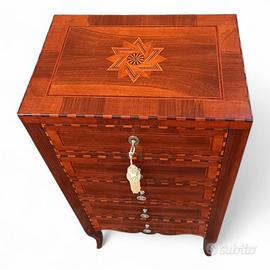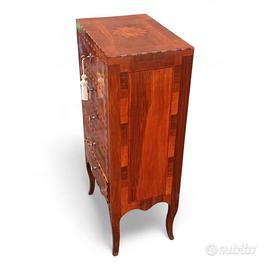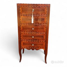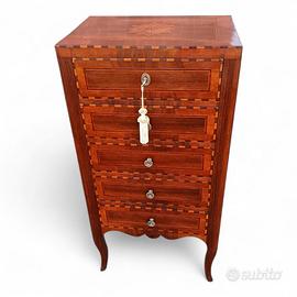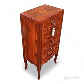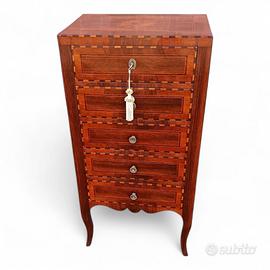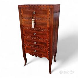 Questa piccola cassettiera in legno è un pezzo di arredamento elegante e funzionale. Realizzata in legno massiccio di alta qualità, presenta un design intarsiato che le conferisce un tocco di raffinatezza. Con i suoi cinque cassetti spaziosi , offre ampio spazio per riporre oggetti di uso quotidiano in modo ordinato. Le maniglie in metallo aggiungono un tocco di stile, mentre i piedini curvati le donano un'aria classica. Perfetta per l'ingresso o la camera da letto, questa cassettiera combina armoniosamente praticità e bellezza. Le dimensioni compatte la rendono adatta anche agli spazi più piccoli. Un mobile durevole e di qualità artigianale, ideale per aggiungere un tocco di eleganza alla vostra casa.