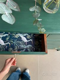 All’interno, i cassetti sono foderati con una bellissima carta da parati dallo stile floreale, scelta con cura per abbinarsi ai toni del mobile e renderlo ancora più speciale.