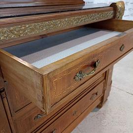 Cassettiera con marmo e specchio primi 900. Struttura in legno intarsiato e