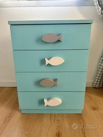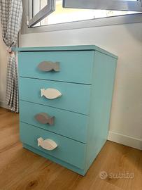 Cassettiera azzurra con pesci in legno bianchi e grigi. Molto bella e capiente.