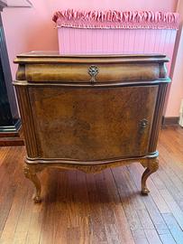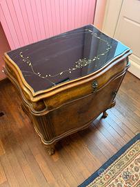 Mobili in legno con finitura radica e piano superiore lucido decorato.