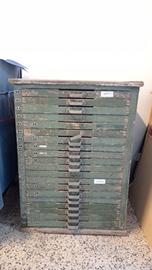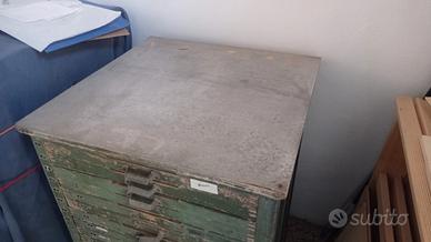 Rara cassettiera vintage da disegno in legno, con piano in metallo sopra.