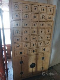 Cassettiera da farmacia antica tradizionale cinese realizzata in legno di olmo, con la sua laccatura ocra originale. Ogni cassetto ha 4 scomparti interni. Il mobile è della fine dell'800. Misure: Larghezza 87 cm, profondità 45 cm, altezza 126 cm. Dimensioni L87 x A126 x P45 Colore: Bianco Peso: 150 parma, Italy Materiale Dominante: Legno Stile: Etnico Nazione: China