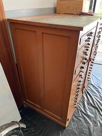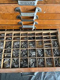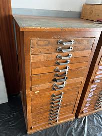 Vendo bella cassettiera da tipografo In legno, buone condizioni generali con qualche segno del tempo, cassetti integri che contengono lettere tipografiche di metallo.