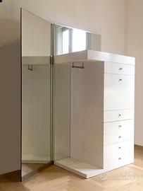 L’anta è a doppia specchiatura che lo rende utilizzabile in centro stanza. Molto contenitivo con cassetti che scorrono lisci e fluidi grazie alla loro accurata progettazione e preciso assemblaggio. Il piano superiore porta profumi è una lastra a specchio retroilluminato che crea un’atmosfera unica. Presenta normali segni di usura che non ne alterano la bellezza.
