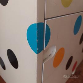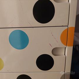 Seletti, pezzo design fuori produzione (2012). Cassettiera/settimino con 7 cassetti in legno serigrafata con pois multicolore. Dimensioni: h. 1,35; prof. 45; lungh. 55. Un piedino da sistemare (come da foto). Diffusi e numerosi segni di smalto rosso sul frontale di tutti i cassetti e piccole scheggiature lungo i bordi (come da foto). Si valutano offerte. Ritiro a domicilio a Roma.