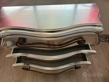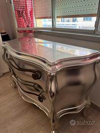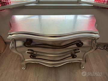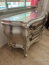 Cassettone / comò / cassettiera in stile libery barocco “foglia argento”, con 4 piedi e 3 ampi cassetti. Maniglie in metallo anticato sagomate a ricciolo.