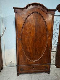 Un elegante armadio a una porta in legno scuro, caratterizzato da un grande pannello ovale rialzato al centro della porta. L'armadio include anche un pratico cassetto nella parte inferiore e una cimasa superiore riccamente sagomata e curva. Si notano alcuni segni del tempo, inclusa una crepa vicino alla base e qualche usura intorno alla serratura/bocchetta.