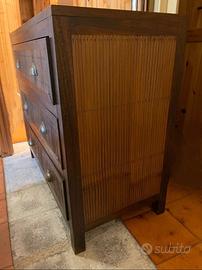 Vendesi cassettiera indonesiana originale, in legno e bambù, con tre cassetti. Il piano superiore della cassettiere, i lati e le facciate dei cassetti sono rifiniti con doghettato in bambù, Misure lunghezza 99,5, profondità 50 cm, altezza 90 cm.
