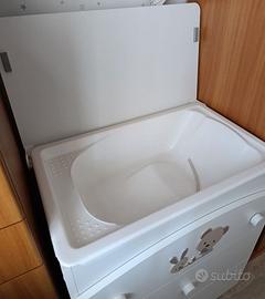Struttura a cassetti in legno melaminico nobilitato. Tre cassetti ad alto scorrimento con guide in ferro e fermo anti- scivolamento. Ruote piroettanti in materiale plastico, di cui le due anteriori dotate di sistema frenante. Vaschetta in PVC, anatomica ed estraibile, dotata di tubo e rubinetto di scarico. Piano fasciatoio ribaltabile con cerniera in materiale plastico con fermo di sicurezza. Azienda: Billo e Pallina. In ottime condizioni.