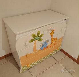 Vendo cassettiera/fasciatoio Pali originale, modello Savana, dalle ottime rifiniture e decorazioni colorate a tema giungla, ideale per la cameretta dei bimbi. Prodotto Made in Italy di alta qualità, robusto e sicuro, con tre ampi cassetti, pomelli ergonomici e spazio capiente per tutto il necessario cambio e cura del neonato.