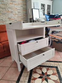 Una soluzione pratica per tenere tutto a portata di mano, dai pannolini ai vestitini, dalle creme ai giocattoli. Per renderlo cassettiera, non serve altro che piegare e fissare la ribalta del fasciatoio per ottenere una cassettiera.