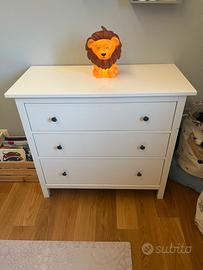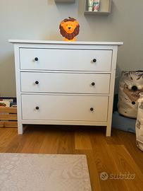 vendo cassettiera HEMNES Ikea in mordente bianco presenta uno striscio, come da foto, sul fianco destro Se interessati ho anche il fasciatoio da poggiare sopra a misura con confortevole materassino (extra di Euro 25)