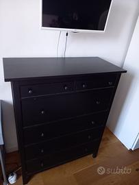Vendo cassettiera modello Hemnes IKEA a 6 cassetti, colore marrone scuro. Mobile solido e capiente, ideale per camera da letto o soggiorno. Presenta alcuni graffi superficiali (visibili in foto). Dimensioni: Larghezza: 108 cm Profondità: 50 cm Altezza: 131 cm Ritiro a mano a Trieste.