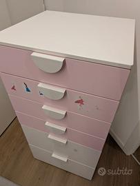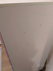 Cassettiera praticamente nuova, cassetti integri perfettamente funzionanti. L'unica pecca della cassettiera è il lato destro in cui compaiono delle scritte (con un po' di cif vanno via)e 4 segni di adesivo di uno specchio tondo Ikea poi tolto. La cassettiera ha degli adesivi che vanno tolti. Nuova e da montare costerebbe 193 euro senza le maniglie che hanno un costo a parte, io la rivendo a 60 euro perché me ne voglio liberare.
