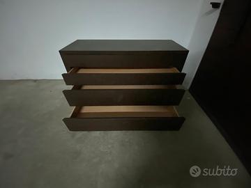 Cassettiera in legno color wenghe con 4 cassetti (piccolo danno laterale) Profondità 53 Largezza 129,5 Altezza 74 - 2 cassetti superiori altezza interna 8 - 2 cassetti inferiori altezza interna 16