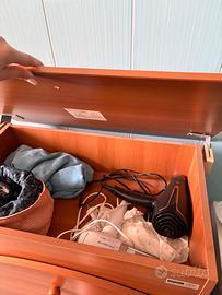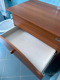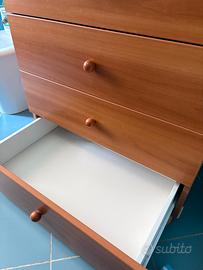 4 cassetti molto capienti con sopra un altro scomparto (in cui una volta era inserita una vasca per il fasciatoio). Ha anche le rotelle per spostarlo meglio Larghezza 67cm Altezza 85 cm Profondita 39cm
