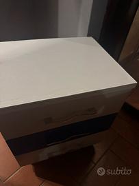 cassettiera in legno massello con cassetti bianche e blu e rotelle usata pochissimo