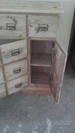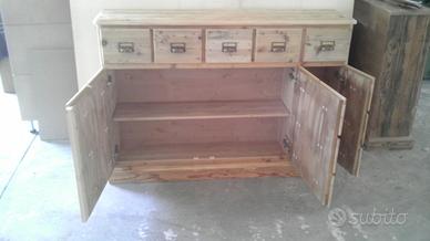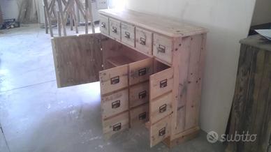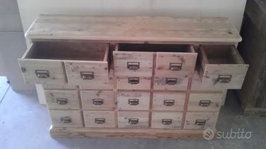 Cassettiera con 20 frontali composto da 3 ante e 3 cassetti di cui 2 doppi e 1 singolo con misure lungh.140 prof.40 h100 e ripiano all'interno in abete nuovo aggiustabile. la coperta e lo zoccolo sono con becco di civetta e le ante e cassetti sono in battuta, costruite con pannello a 3 strati in abete massello in modo che non si incurvi nel tempo e 6 frontali finti cassetti applicati, le ante si aprono su 2 cerniere da cucina regolabili per ogni anta. intendesi assi di vecchi solai o parancole di case rurali antiche, tutto al naturale come lo si vede in foto, lo si apprezza così come lo si vede al grezzo ben levigato in modo che sia morbido al tatto, tutto in pattina nella parte anteriore. a richiesta la si può finire con effetto grezzo naturale trasparente impermeabile. la cassettiera è stata realizzata su commissione di conseguenza non teniamo magazzino ma essendo i diretti produttori possiamo riprodurla uguale o su specifiche/esigenze del cliente. li facciamo noi con le nostre mani e siamo in grado di soddisfare qualsiasi richiesta che può essere su misura del cliente sia cassettiera o altro sia legno vecchio sia altro legno. il prezzo si intende franco fabbrica grezzo compreso di imballo e maniglie, non comprendente di iva. per domande o dubbi contattateci P.S. eseguiamo MOBILI SU MISURA sempre con legno di abete antico o altro. per noi conta dare vita al vostro sogno DIRETTAMENTE DAL PRODUTTORE. ASTENERSI RIVENDITORI E COMMERCIANTI