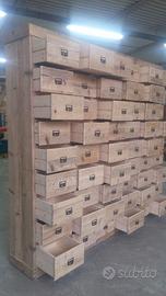 cassettiera costruita in legno di antichi solai intendesi case rurali vecchie o parancole recuperate con la pattina originale che il tempo ha fatto. le misure lunghezza 252 altezza 240 profondità 45 cm. Predisposto con 54 cassetti singoli in legno vecchio con maniglie a finestrella internamente costruito in abete nuovo con sponde da 18 mm e fondo del cassetto da 14 mm con incastro laterale su cui scorrerà su guide in legno e unito a coda di rondine. La predisposizione dei cassetti su file 9 verticali e 6 orizzontali. con utile interno cassetto da circa lungh. 33 prof. 36 h 17,5 con cornicione superiore e zoccolo in pattina dritti lineari. Il tutto finito e carteggiato e levigato in modo che sia morbido al tatto. tutto al naturale con finitura cerata e tinteggiato noce medio su abete bianco. la cassettiera è già stata costruita e venduta su commissione di conseguenza non teniamo magazzino ma essendo NOI i diretti costruttori li facciamo noi con le nostre mani siamo in grado di soddisfare qualsiasi richiesta che può essere su misura del cliente sia cassettiera o altro sia legno vecchio sia altro legno. il prezzo si intende franco fabbrica compreso finitura naturale cerata su legno vecchio e tinteggiato le parti bianche in abete nuovo con imballo con maniglie non comprendente di iva. per domande o dubbi contattateci P.S. eseguiamo MOBILI SU MISURA sempre con legno di abete antico o altro. per noi conta dare vita al vostro sogno DIRETTAMENTE DAL PRODUTTORE. ASTENERSI RIVENDITORI E COMMERCIANTI