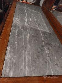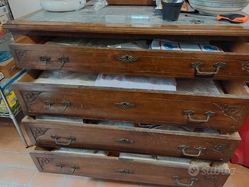 Cassettiera in legno scuro. Con intarsi a disegni e con una grande specchio. Ben tenuta e senza tarme. Il piano è in marmo grigio.