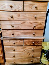 Cassettiera 5 cassetti in legno massello di pino. Mobile solidissimo. Se può interessare, sono disponibili 3 cassettiere identiche con possibilità di sovrapporle. In buone condizioni. Largo 83 cm alto 70 e profondità 38 cm. Il prezzo è per una cassettiera