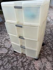 Vendo cassettiera in plastica con quattro cassetti con chiusura a pressione e ruote. Ritiro a mano