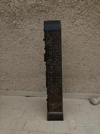 Cassettiera in stile etnico vintage, spesso descritta come un mobile a "piramide" o "settimino" per via della sua forma alta e stretta con numerosi cassetti. Realizzato in legno massiccio intagliato a mano e presenta motivi geometrici o tribali sui frontali dei cassetti. La finitura scura è definita "black washed". Dimensioni 46 x 135 x 23 Presenta una parte superiore arrotondata e 10 cassetti decorati con intagli intricati e pomelli centrali. Grazie alla sua forma slanciata, è ideale per ingressi, corridoi o camere da letto dove lo spazio è limitato. Questo mobile ha una probabile origine orientale o africana, talvolta da regioni come Bali, Indonesia.