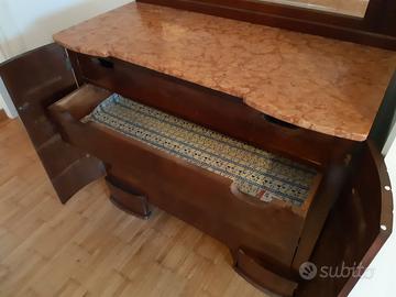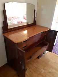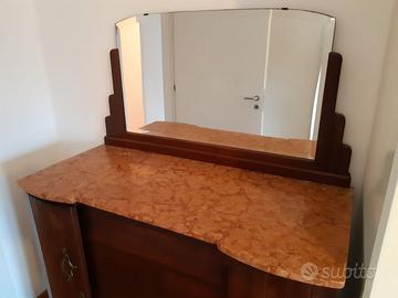 Bellissimo mobile con cassettiera e specchio. In legno massiccio e ripiano in marmo rosa. Originale, tenuto benissimo. Dimensioni: larghezza 117,50 cm profondità 54 cm altezza complessiva 160 cm (senza specchio 101 cm)