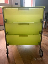 Cassettiera kartell Mobil, verde acido, tre cassetti, con quattro ruote. Struttura acciaio cromato. Contenitori e ripiani PMMA trasparente.
