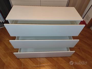 Cassettiera bianca, marca Mondo convenienza, con tre cassetti, misure indicate, larghezza 109, profondità 40 ed altezza 77. Si presenta in buone condizioni Non la spedisco.