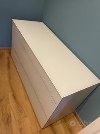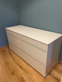 Cassettiera in legno con frontali e piano in vetro temperato. Marca Imab Group , perfetto stato. Due cassetti profondi e uno basso, frontali interi ma interni divisi in due parti. Fodere interne in legno. Larg. 140, altezza 72, profondità 53.