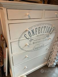 Solendida Cassettiera bianca in stile provenzale composta da 4 cassetti capienti e 2 piu piccoli superiori, nuova usata poco. Dimensioni cm 109 lunghezza x 49 profondità x 132 altezza.