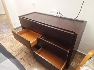 Vendo bellissima cassettiera dal design moderno e minimale, perfetta per camera da letto, soggiorno o ingresso. Il mobile è caratterizzato da una finitura in legno scuro con venature a vista e un'elegante struttura a "cornice" che ne esalta le linee pulite.