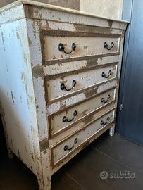 Cassettiera Porquerolles in legno stile shabby con 4 ampi cassetti rivestiti con carta Fiorentina, oggetto in ottime condizioni.