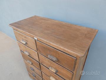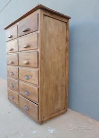 Cassettiera mobile in legno di pioppo dotata di dodici cassetti frontali ed appartenente d'epoca alla prima metà del '900. La semplice e lineare struttura conferisce una sobria eleganza. La ricerca di un decoro essenziale si riflette anche sulla scelta dei montanti, privi di elementi decorativi. Pratico e funzionale, si presenta come un versatile ed originale elemento d'arredo. Presenta qualche segno d'usura/ i pannelli non sono in legno massello.