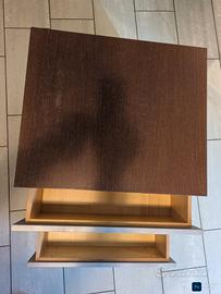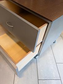cassettiera in legno su 4 ruote colore argento sopra in legno canaletto , due cassetti . Dimensioni: altezza 69 cm. profondita' cm. 60 , larghezza cm 70