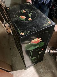 Mobile orientale laccato nero, decorato con motivi floreali dipinti a mano, composto da più cassetti superiori e vano con ante inferiori.