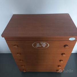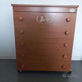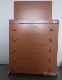 Regalo cassettiera marca Pali in ottimo stato, colore marrone tipo noce, 5 cassetti, ribalta per fasciatoio, rotelle funzionanti. Dimensioni H 90cm, L 77cm, P 45cm.
