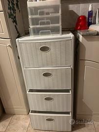 Vendo cassettiera bianca con 4 cassetti capienti, in ottimo stato. Struttura leggera ma stabile, ideale per bagno, camera, ingresso o cabina armadio. Incluso anche piccolo organizer portaoggetti trasparente da appoggio (visibile in foto).