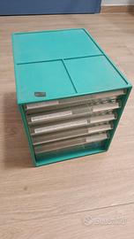 Cassettiera portadocumenti formato A4, misure nella foto. 5 cassetti, il più basso è alto il doppio degli altri. Materiale plastica