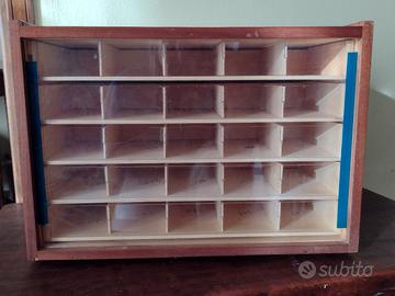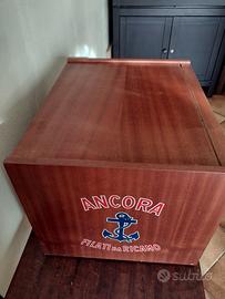 Mobiletto da merceria vintage marca Ancora con 5 cassetti in legno, divisi in 10 scomparti ciascuno. Base con piedini, retro trasparente in plastica.